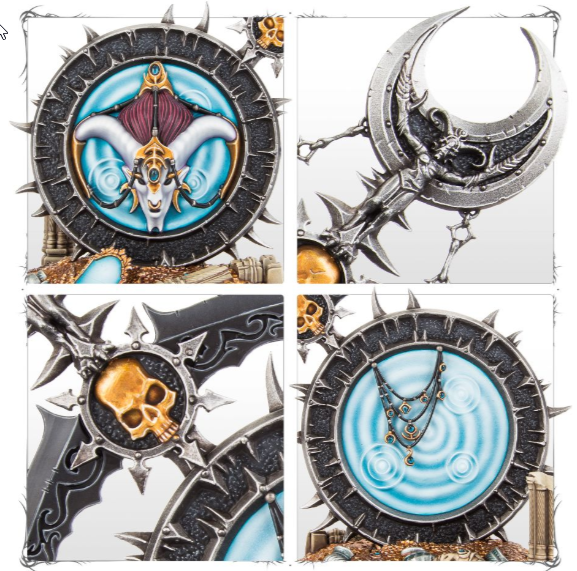 A Fane of Slaanesh is a focus of worship wrought in precious metal. Around it are laid offerings to the Dark Prince, but in truth it is one of his most exalted greater daemons that peers through. Those whose offerings meet with the creature’s approval are rewarded highly – but those who offend are justly punished.